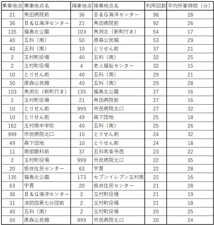 利用回数が高い経路パターンのみを抽出して、回数が多い順にリストアップしました。角田病院前(21)とB&G海洋センター(36)の間の経路パターンが、双方向とも利用頻度が特に高い結果となりました。この経路パターンの利用実績データを調べたところ、午前中に地点36から地点21に移動して、午後には地点21から地点36に逆に移動する利用の傾向が見られました。平均所要時間は、利用実績データの所要時間を合算してから利用回数で、割って算出しました。やはり市民病院北口 (999)に関わる経路パターンの所要時間が30分以上となっています。