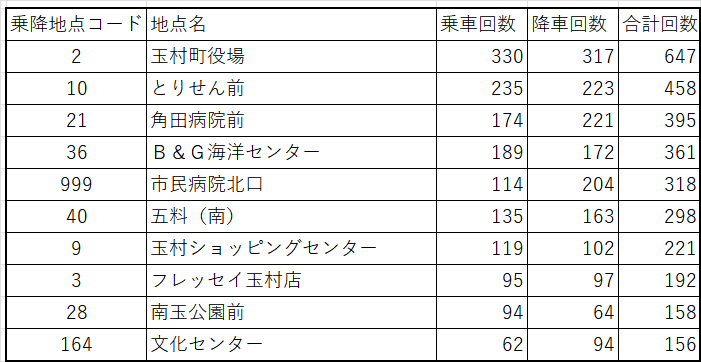 3. 出発地の性格が強い地点:南玉公園前 (28) 住宅街に近いこの地点は、乗車回数が降車回数を上回ることが多いです。住民がここから役場や病院、スーパーなどの拠点施設へ向けて出発する際の「玄関口」としての役割が強いことを示しています。