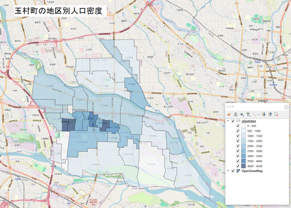 以下の地図では、玉村町の地区別人口密度を色別に段階的に塗り分けました。 玉村町を東西方向に走る県道142号の中央から西側にかけて、人口密度が高い地区が見られます。人口密度図では、各地区が薄い青色で区分されていて、右下の凡例の人口密度の数値の単位は「人/平方キロメートル」です。