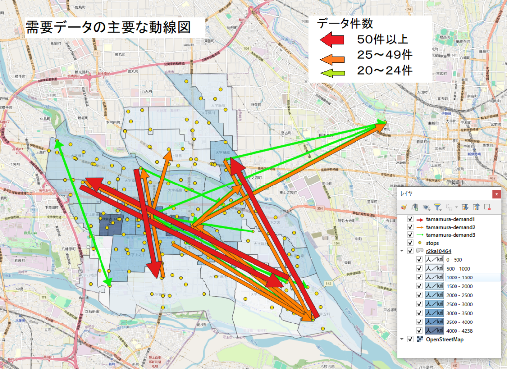 「たまGO」は予約に応じて運行されるため、乗車(出発地)と降車(目的地)の回数を合わせることで、その地点がどれほど頻繁に利用されているか(地点の活発度)が見えてきます。