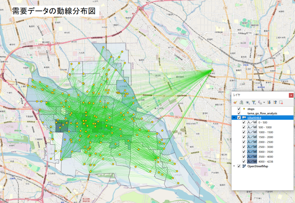 地区別人口密度と、たまGOの乗降地点