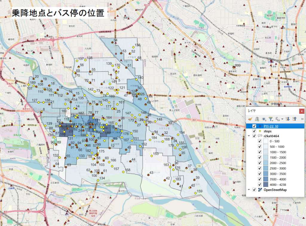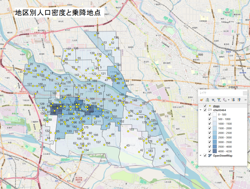 地区別人口密度の図に、乗降地点の黄色の〇マークを重ねて表示したのが、下の図です。図をクリックすると大きい図が表示されます。乗降地点コードも併せて表示してみました。尚、右上側の「999」の乗降地点は、伊勢崎市民病院です。