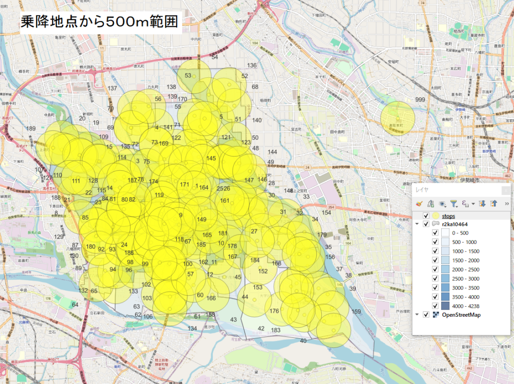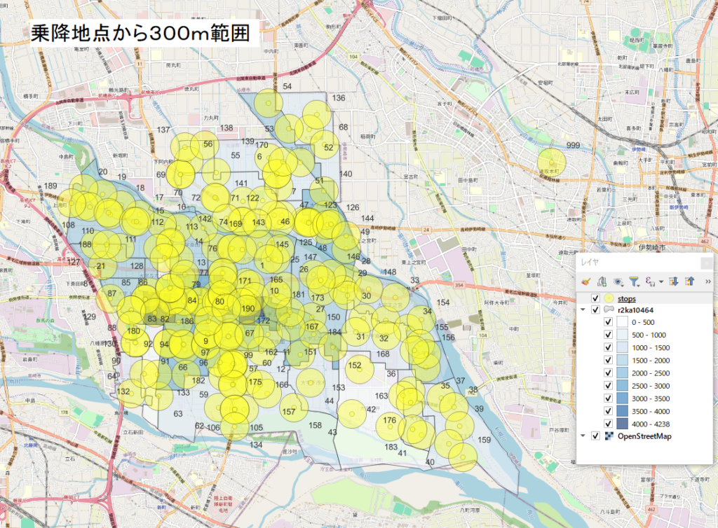 次に、たまGOの乗降地点の配置が、玉村町の全域をどの程度、網羅しているか調べてみました。まず乗降地点の黄色の〇マークから、半径300mの薄い黄色の円を描いてみました。すると、薄い黄色の円の中に含まれていない地域がかなりあることが分かりました。